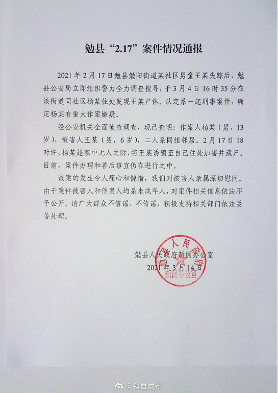 3月14日,陕西勉县针对“2.17”案件情况进行了通报: