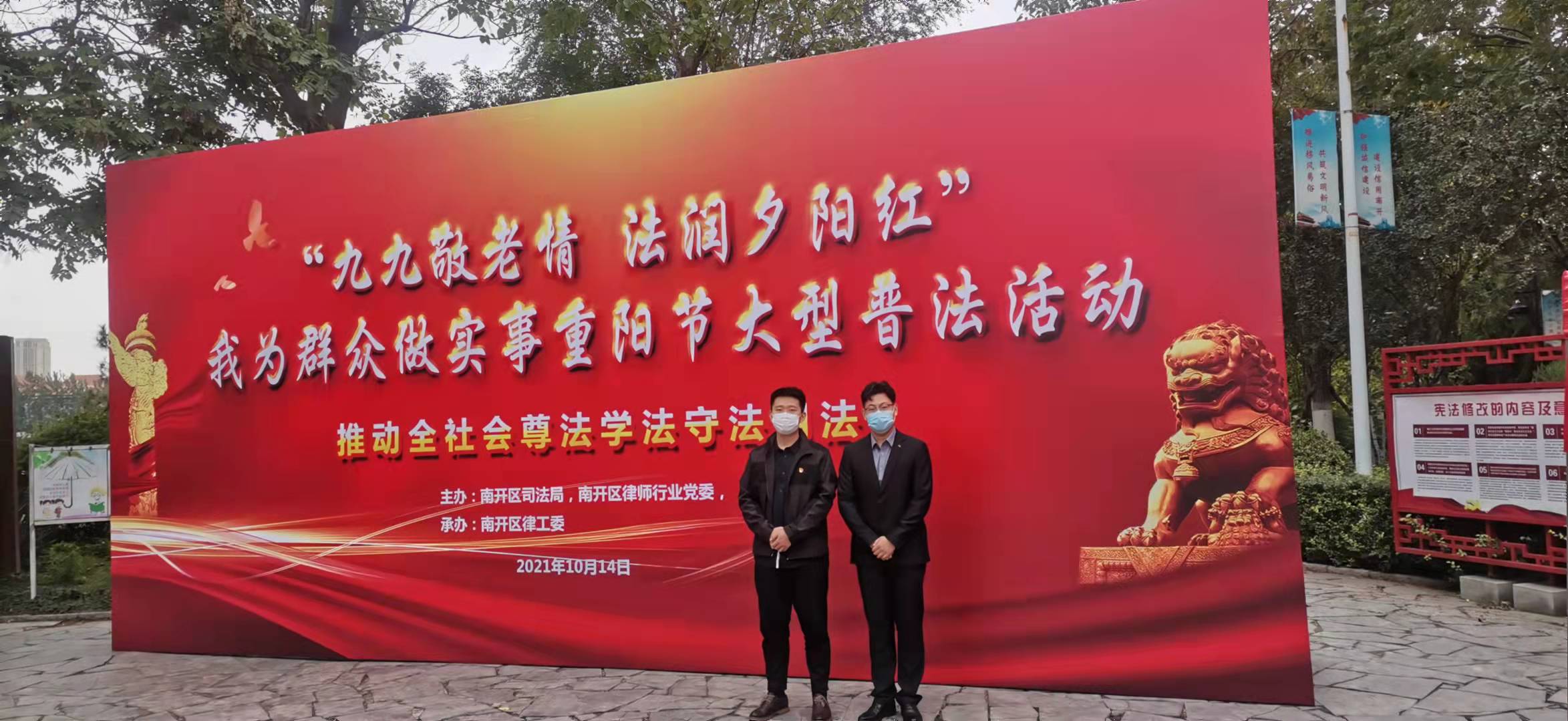 2021年10月14日,为响应号召,天津唯辩律师事务所张明阳律师、白莉律师、胡英魁律师(实习)前往天津市南开区长虹生态园参加“九九敬老情 法润夕阳红”我为群众做实事重阳节普法活动,为市民群众宣传《民法典》,接受市民群众现场咨询,解答相关法律问题。
